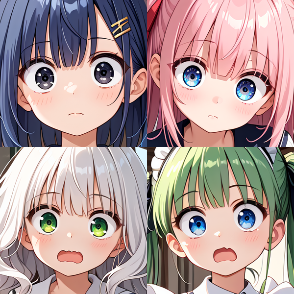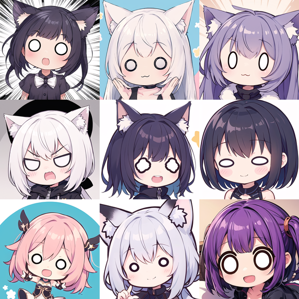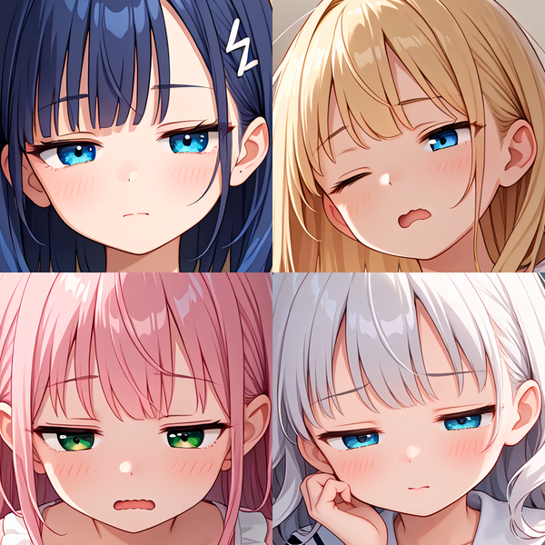 また、例えば、眼だけは吊り目にしたいという場合、このLoRAを使うのではなく、「V字形眉(ドヤ顔他)」「吊り目」「八重歯付きのニヤけた口」の3つを同時に適用することで再現できます。