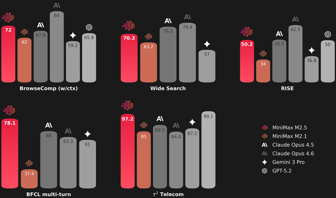 Compared to its predecessors, M2.5 also demonstrates much better decision-making when handling agentic tasks: it has learned to solve problems with more precise search rounds and better token efficiency. For example, across multiple agentic tasks including BrowseComp, Wide Search, and RISE, M2.5 achieved better results with fewer rounds, using approximately 20% fewer rounds compared to M2.1. This indicates that the model is no longer just getting the answer right, but is also reasoning towards results in more efficient paths.