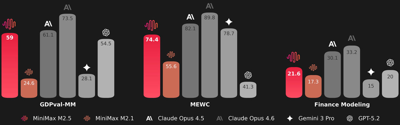 M2.5 was trained to produce truly deliverable outputs in office scenarios. To this end, we engaged in thorough collaboration with senior professionals in fields such as finance, law, and social sciences. They designed requirements, provided feedback, participated in defining standards, and directly contributed to data construction, bringing the tacit knowledge of their industries into the model's training pipeline. Based on this foundation, M2.5 has achieved significant capability improvements in high-value workspace scenarios such as Word, PowerPoint, and Excel financial modeling. On the evaluation side, we built an internal Cowork Agent evaluation framework (GDPval-MM) that assesses both the quality of the deliverable and the professionalism of the agent's trajectory through pairwise comparisons, while also monitoring token costs across the entire workflow to estimate the model's real-world productivity gains. In comparisons against other mainstream models, it achieved an average win rate of 59.0%.