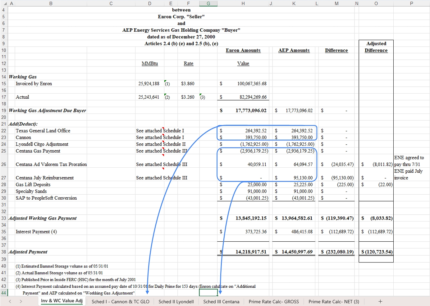 Example 1: Review the Inv & WC Value Adj summary tab and add the missing cross‑sheet data references to the other worksheets so the roll‑up pulls the correct figures. Return the updated file with those links in place.