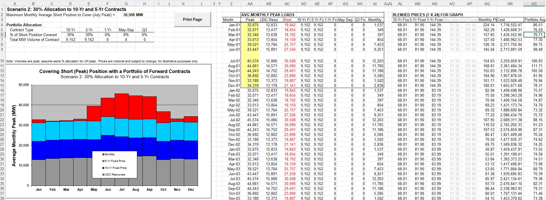 Example 2: Add a new worksheet named "Scenario3" to the same workbook, mirroring the structure, row/column layout, monthly detail table, and chart area of "Scenario1". For Scenario3, update the hedging assumptions to a balanced allocation: 10-Yr 25%, 5-Yr 20%, 1-Yr 15%, May-Sep 20%, Q3 15%. Keep the note "Maximum Monthly Average Short Position to Cover (July Peak) = 30,508 MW" unchanged; only the new sheet should be added, and formulas may be used within it.