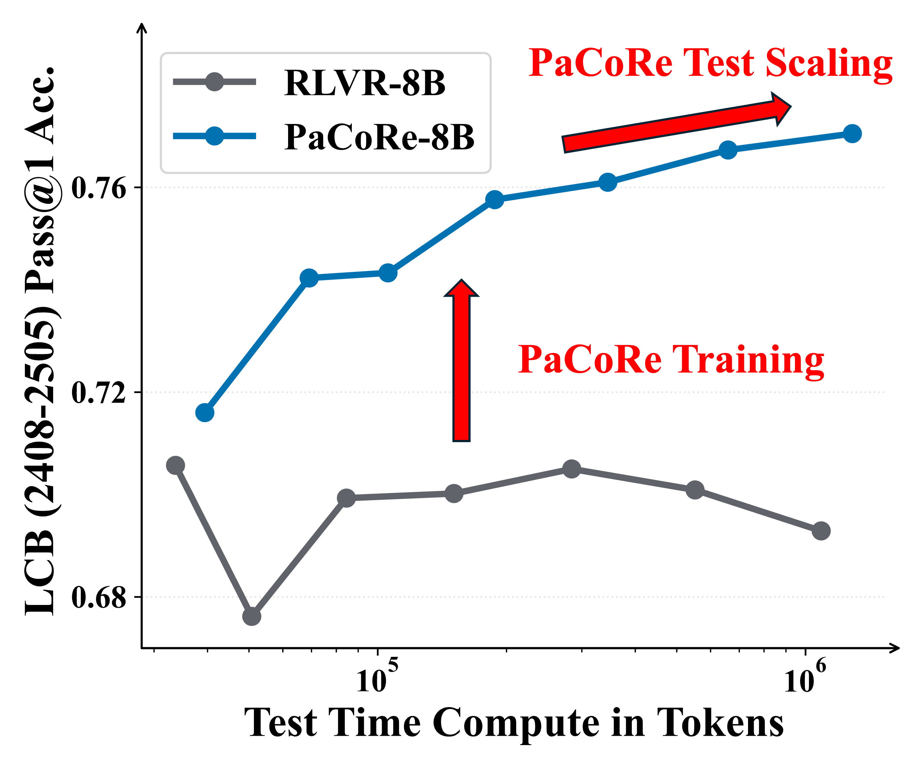 | PaCoRe-8B (medium) | 92.9 (869k) | 76.7 (659k) | 14.6 (694k) | 45.7 (45k) |